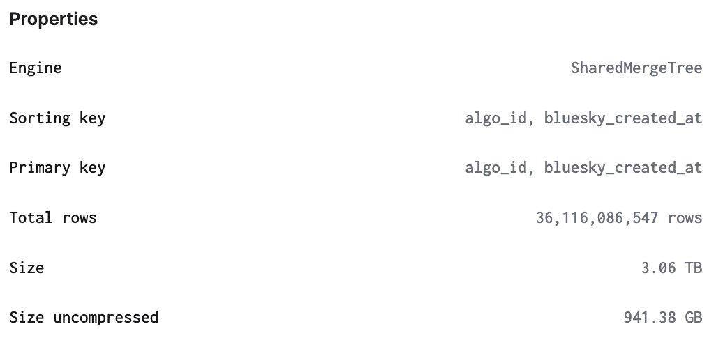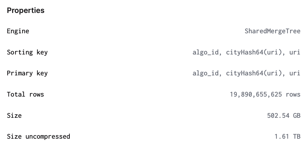 SETTINGS index_granularity = 8192, max_bytes_to_merge_at_max_space_in_pool = 10737418240This table keeps track of which posts appear in which feeds as a support table (i.e. where does this post appear throughout Graze feeds, and vice versa). There's about 20 billion records on this table: