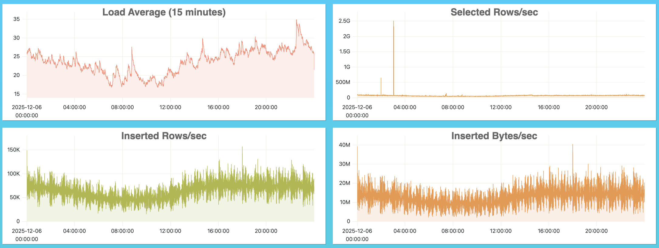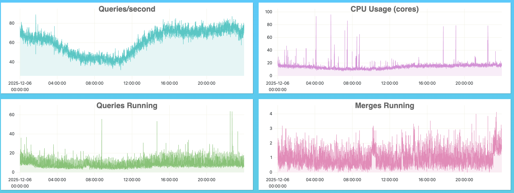 We use an old school monitoring page some customer support person at Clickhouse showed us for tracking activity on the database. On a typical Saturday at 4pm west coast time, our typical load looks like:
